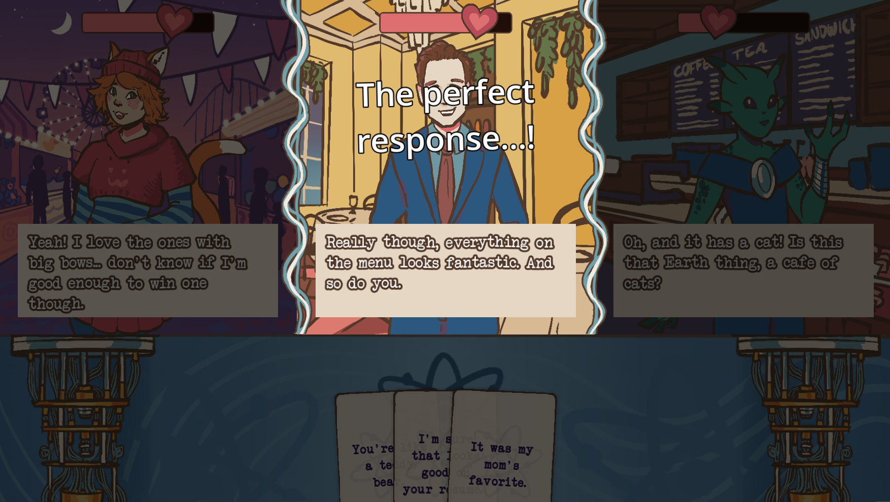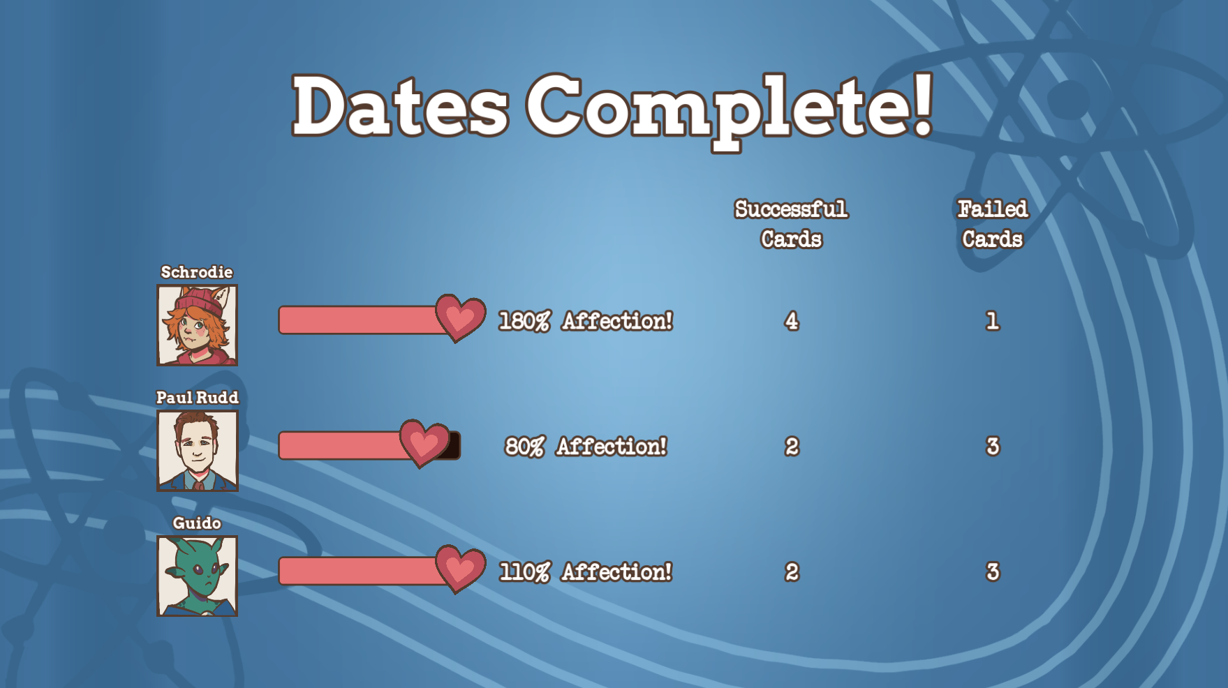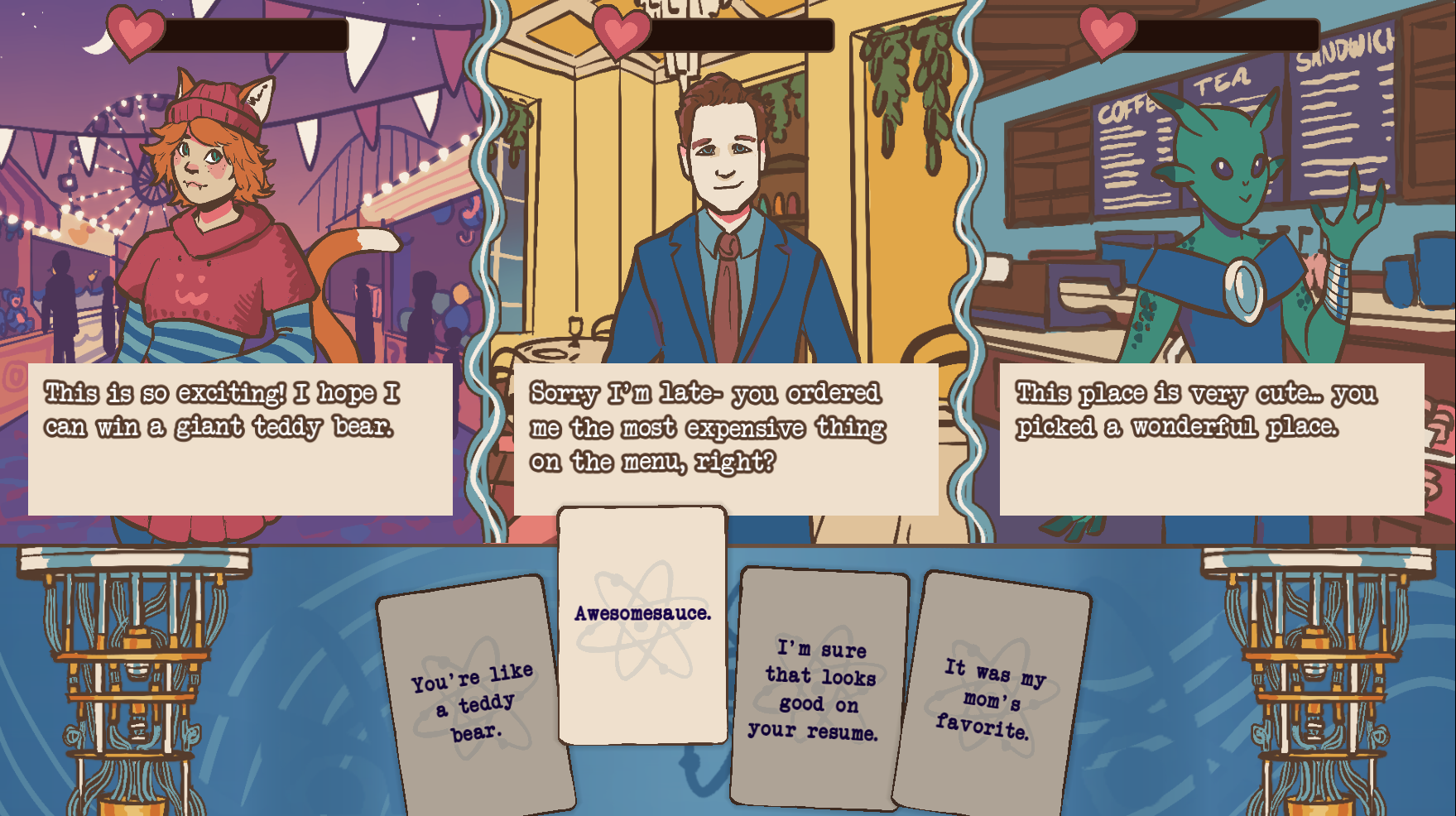 When dating apps go quantum, it’s easy to get tangled up in drama in Entangled Love! With this newest technological advancement in dating, you can superimpose yourself over three dates-- but juggling three conversations at once isn’t so easy. Play your cards right (literally) to balance the best responses to all three of your romantic candidates at once, and try not to scare any of them off. If you can figure out how to be funny, sincere, or flirty in the right moments, you might be able to get a second date! Well, second dates? Either way, try your hand at the quantum dating puzzle in Entangled Love!
